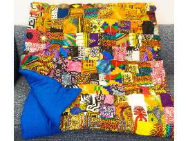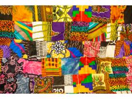 This colorful patchwork quilt features panels with original African design patterns, conveying aspects of cultural history. This quilt was design and crafted by students in our Sewing Club.