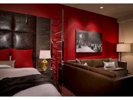 The luxury suites present a fresh and contemporary feel, blended with styling that spans the decades. Each is themed with Swing era-inspired pinstriped carpeting, Art Deco accents, and a photograph of an iconic Las Vegas celebrity, many of whom frequented Golden Gate.