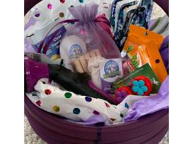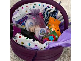 Pretty purple gift basket for the gardener in your life. Items for plants, hummingbirds and gardener. Give as a gift or keep for yourself.