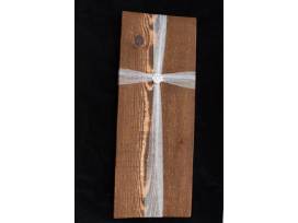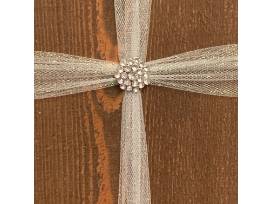 Beautiful Hand Made Wood Cross Wall Art, Cedar with Dark Walnut Stain, 19in x 7.25in,Tulle material enhanced with iridescent micro glitter, and broach centerpiece.