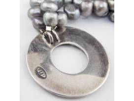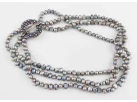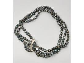 A striking multi-strand freshwater pearl necklace with a sterling silver "Saki" toggle clasp. Three strands of platinum colored pearls can be worn hanging straight or twisted.