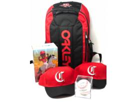 4 Reds tickets, backpack, blanket, 2 hats, signed baseball, stickers.