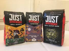 Three bags of "Just Coffee," which is 100% fair trade & certified organic: