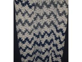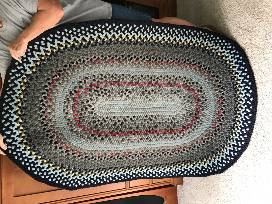 A large, decorative afghan with navy and gray stripes and an attractive, hand-crafted oval rug (3 1/2' x 5'). This hand-braided rug is an excellent example of a historic skill that is seen less and less!