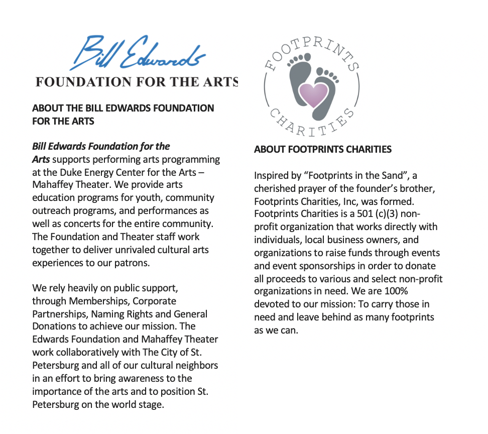 All proceeds will benefit the Bill Edwards Foundation for The Arts whose initiatives are to encourage and support the Arts and artists in St. Petersburg.