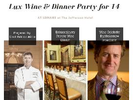 Host an extraordinary private wine dinner party for 14 people at Lemaire at The Jefferson Hotel prepared by Chef Patrick Willis. Your special dinner will include delicious wines selected and presented by wine celebrity Bartholomew Broadbent of Broadbent Selections, who will also discuss each wine with your guests. This is the perfect opportunity to entertain clients, family or friends.