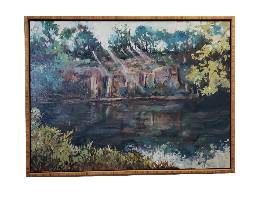 "Early morning quarry, Belle Isle" is acrylic and measures 30" X 40". It has a bamboo frame.