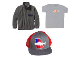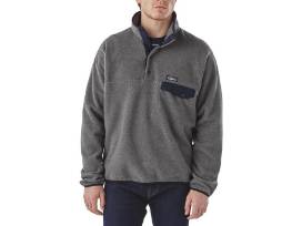 Patagonia Men's Synchilla Pullover in grey with navy trim (size large). Warm and durable, the recycled polyester fleece pullover has a classic Snap-T pocket and placket and is Fair Trade Certified sewn.