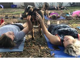 Come Experience Goat Yoga with Two (2) Passes to Goat Yoga. Take the widely-known stress-reducing and mind-body-connecting benefits of yoga, and couple that with the joy, silliness, and unpredictability of hanging out with goats and voilĂ , the bliss train has arrived. Megan was a certified yoga instructor when she became a "goat mom," so naturally people started to ask if she'd consider doing "Goat Yoga" - she and Jason are happy to be able to bring this practice to Atlanta! What started as a viral fad, turned out to be one of the most stress-relieving, therapeutic, FUN ways to practice yoga.