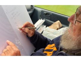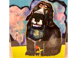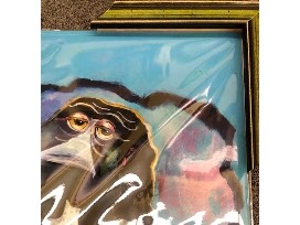 Love Dogs? This is a Unique Don Nedobeck whimsical Black Lab and is personalized with a note and image from the artist on the back of this black lab print, with wooden and glass custom framing. Photos of the artist signing.