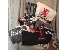 Basket includes: logo cinch sack, 2019 gray t-shirt (XS), black logo t-shirt (3X), Gray/dark gray henley (L), "BAC was Here" v-neck t-shirt (L), BAC tank (S), black logo tank (M), logo full zip jersey hoodie (XS), logo ladies black/red polo (S), 2 stickers, 2 lapel pins, lanyard, license plate frame, 4 pk Redd's Wicked Apple Cider.