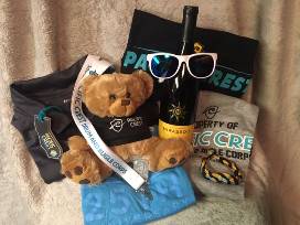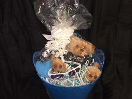 Basket includes: logo lady's charcoal polo (L), men's black logo t-shirt (XL), ladies 25th Anniversary t-shirt (L), gray henley (L), braided bracelette, lanyard, luggage tag, sun glasses, dog tag, teddy bear, Mirassou Pinot Noir.