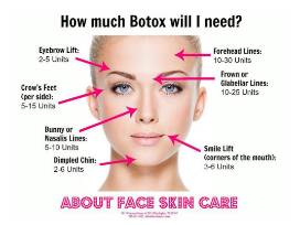 BOTOX at least 50U, sufficient to cover facial musculature - "Crows feet', forehead and between the eyes. See diagram below for an approximation of Units needed.