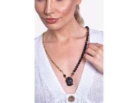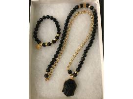 Jewelry from Jada Jo including a "Change" necklace featuring a black and gold Buddha with matching black and gold bracelet, plus a Labradorite gold pave diamond necklace with matching bracelet. All featuring 14k gold. Jada Jo Jewelry is styled with stories from around the world. From the pristine beaches of Bali to the mysterious souks of Morocco, the jewelry is curated and inspired from each unique culture.