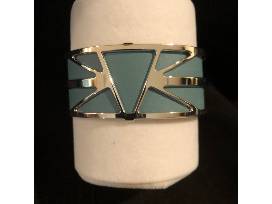 Les Georgettes Bracelet by Altesse. Crafted by hand, silver jewelry bracelet with interchangeable leather bands. This 25mm Bracelet is called 'IBIZA' and contains a reversible leather band (one side is Patent Yellow, the other side is Bluestone). Additional leather color bands are available for purchase.