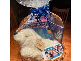 This fun basket contains one Magical Memories Coupon Book, How Noel Saved Christmas book, Outer Space Puzzle, Cosmic Star Disc Shooter, and a Slushy Polar Bear stuffed animal.