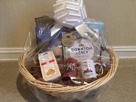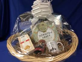 Downton Abbey fan! Gift basket includes organic scone mix, tea mug and limited edition tea, a Downton Abbey cookbook, Clue Game, 2020 wall calendar, Entertaining at the Real Downton Abbey book, and an ornament.