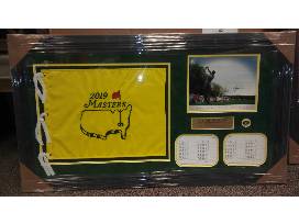 Tiger Woods framed 2019 Masters Flag with upper deck authenticated and signed 8" x 10" photo, official Masters ball marker and two (2) Masters score cards.