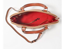 Lined interior, two front-wall slip pockets, back-wall zip pocket, back-wall slip pocket, key keeper