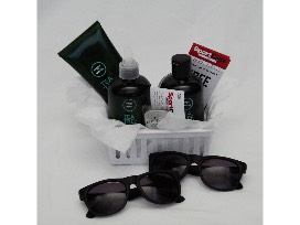 Gift basket from Sports Clips containing three full sized products from TeaTree (shampoo, moisturizer, and hair gel), one from American Crew (defining paste), and two free hair cuts. Finish your look with a pair of sun glasses and solid cologne from Mr. Gladstone.