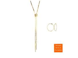 Very elegant lariat, paired by stunning hoop earrings with micro-pavé stones inside and out and our signature press & release safety clasp. Fine craftsmanship and Italian design. Heavy gold plating over solid sterling silver and the highest quality zirconium stones (great alternative to diamonds). The gorgeous slider makes the necklace adjustable. Hypoallergenic. Exceptional quality and stunning packaging! Daring and glamorous, these fine jewels radiate timeless elegance and make you feel extra special.