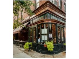 The curved copper and wood exterior facade still has the original stained glass window with the name Peter Doelger Extra Beer. The physical bar, tin ceiling, most of the tile flooring and much of the woodwork is original from the 1887 period.