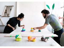 Adam Frezza & Terri Chiao are an American artist duo whose work explores play and craft across a range of media, including painted sculpture, installation, collage, photography, design, and public art. Also known as CHIAOZZA (rhymes with "wowza" or "yowza"), Adam and Terri have exhibited their collaborative work in solo exhibitions in New York, Philadelphia, and Los Angeles, in numerous group shows around the US, and in a variety of art and design venues internationally. The studio was founded in 2011 and is based in New York City.