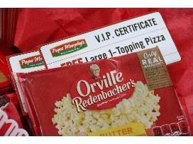 Some movies are meant to be seen on the big screen while others need to be watched from the comfort of your couch. This package has just what you need for each situation! Included are two Cinemark passes, certificates for two large 1-topping pizzas from Papa Murphy's Pizza, nine boxes of movie theater candy, four reusable popcorn boxes, ready to eat popcorn and 14 bags of microwavable popcorn.