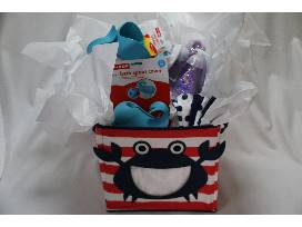 Bath-time is always more fun with water toys! Includes a fabric crab tote, Skip and Hop Moby bath rinser, wash clothes and Johnson & Johnson sleepy time gift set.