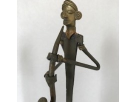 3 Abstract figurines of metal brass musicians. One playing saxophone; one playing accordion and one on cymbals. Each figurine is approximately 18" tall. Black wooden stand included, 11.5" wide x 6" deep x 1.5" tall.
