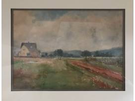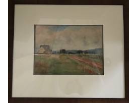 "The Yellow House" is a watercolor on paperboard. This country scene shows an almost Impressionist style of landscape by Percival deLuce (1847-1914). This noted American turn of the century artist is an ancestor of Judith deLuce, professor emerita Miami University. This signed painting is matted and framed. 20"H x 23.25" W.