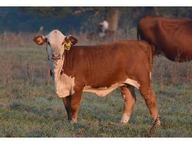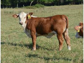 This polled heifer calf was sired by our Ribeye bull and she's out of a Greenview Farms F-1 Braford cow. We bought her dam as the pick of the Jonny Harris herd in one of the Houston sales. The breeding on this heifer would have her show as a Braford Base but when bred to a purebred Braford bull, her offspring would be Braford. This heifer has good EPDs across the board and we reserve the opportunity to flush her once after she makes a cow.