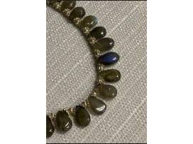 Handmade necklace features both teardrop and tiny faceted labradorite stones with flashes of blue.