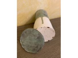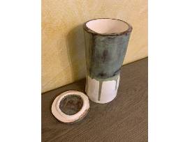 A beautiful pale green and white jar (8.5" tall and 4" wide) with a matching ceramic lid. Without the jar top, it can be used as a vase. This one-of-a-kind item was created by the Salihah Aakil, a talented teen artisan in our community.