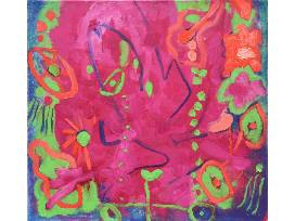 "Pink Sharks on Bikes," is part of a series of paintings about sharks, a subject that I continue to revisit over time. I have had an interest in sharks since early childhood and often used this theme in school projects. In this piece, I strove to explore color and the absurdity of sharks on bikes.