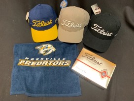 Golf package includes Nashville Predators golf towel, (3) Titleist hats (M/L), and one dozen Titleist Pro V1x golf balls