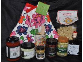 Fun way to spice up your palate with artichokes, cucumber wasabi dip, black truffle almonds, an olive tapinade, balsamic vinegar, Italian arrabiata sauce, kalamata olives, virgin olive oil, Especias del Sol salts, pasta, 2 jars of truffle sauce, and spaghetti sauce.