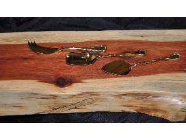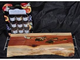 One-of-a-kind, handmade wooden charcuterie board with gold spreaders to serve every type of cheese and assorted jams.