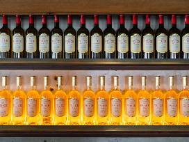 Guests dine surrounded by design elements of the Tuscan tradition, wine jugs hanging from the ceilings, surrounded by subdued lighting, exposed brick walls lined with linear shelves filled with wine, as well as rich, tufted leather seats.
