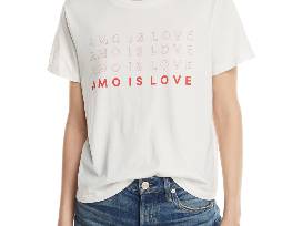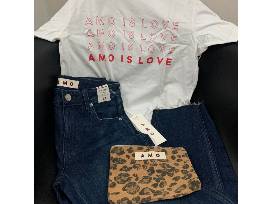 This package includes a pair of AMO Stix Crop Slim Fit Mid Rise jeans in Eclipse Wash, Size 26 (hits above the ankle), an AMO is Love Classic Tee in Vintage White, Size XS, and a great AMO animal print zipper pouch.