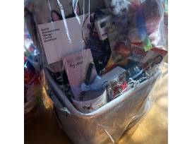 Dog leash, Lean treats, Sand & Paws Soy Candle, Kong Rewards (large), Stuffed Pig dog toy, Pet safety light, 2 dog dish towels, Dog throw blanket, notepad, Dog mug, Timer. also a $25 Grooming Gift Certificate from Pampered Paws - 6135 N Northwest Hwy.