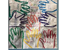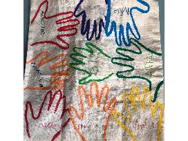 Colorful decorated tote bag made with love by Ms. Contreras' Class!