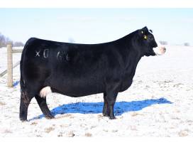 A classy baldy MaineTainer from Maternal Made and Camille X066! This April heifer has plenty of width and size and balance. She always gives the snazzy look that goes to the front of the line!