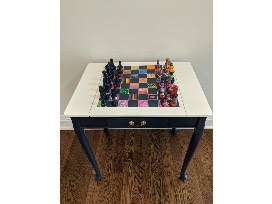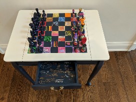 A refinished game table you can enjoy playing chess, checkers, or even backgammon can be played on! The 1st graders painted half the squares on the chess/checker board, painted a set of chess pieces, a set of checker pieces and signed their names in both drawers that hold the chess and checker sets!