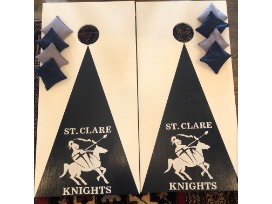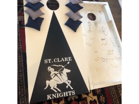 This Cornhole Set was made by Johnathon Hertzler and Clint Hertzler. The students of 5th grade (both Miss Frey and Mrs. Fischer) personalized this item by signing the interior. The see also includes 4 navy and 4 gray