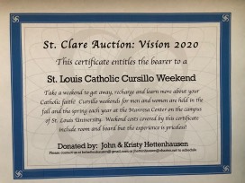 This stunning package includes 2 certificates for a St. Louis Catholic Cursillo Weekend at the Manresa Center on the campus of St. Louis University. Weekend coats covered including room and board.