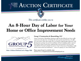 Group 5 Construction & Remodeling is donating an eight-hour day of labor for your home or office improvement needs. If you have a list of things that need to get done around the house or the office, here is your chance! Project ideas include, but are not limited to, light fixture/fan replacement, small flooring projects, painting, trim work, door installation, bathroom vanity/faucet updates, and more! If your project estimate exceeds 8 hours, additional labor may be purchased. The owner will be responsible for all materials needed for the project(s). Group 5 Construction & Remodeling is a fully insured, veteran owned, local small business, and we are a family at St. Clare Catholic School!