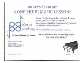 If you child is interested in picking up a new instrument, be sure to bid on this music package from 88 Keys Academy! This certificate entitles you to six one-hour music lessons on the instrument of your choice including piano, violin, guitar, base guitar, drums, cello, voice lessons, jazz piano, saxophone, ukulele, harmonica, trumpet, trombone, flute and more! Book included for the instrument of your choice.