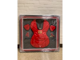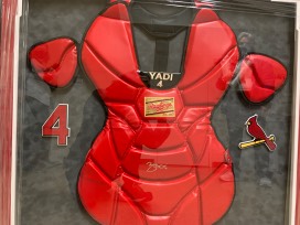 Here's your opportunity to own a priceless piece of sports memorabilia. This framed chest protector is signed by the St. Louis Cardinal's beloved catcher, Yadier Molina. In his 17 years with the Cardinals, Yadi has collected a mountain of accolades and awards, including 2 World Series Championships, nine Golden Glove Awards, one Silver Slugger Award, selection to 9 All-Star teams, earned the Roberto Clemente Award in 2018, and is destined to be a future Hall of Famer. Don't let this item slip through your hands! Included is a certificate of authenticity.
