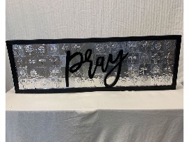 This beautiful, handmade decor is sure to be a keepsake centerpiece, courtesy of Heather DeVine and the 7th grade class. Each student personalized a cross on a reflective tile. Measures 14 x 42 inches.